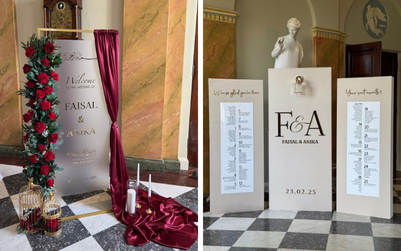 Anika brought an extra layer of creativity to the day: she DIYed elements of her own wedding décor, which became the starting point for her business, Ani Creates. She now offers bespoke pieces such as welcome signs, mirror signs, guest book tables, gajra and jhumka boards, and plinth hire.